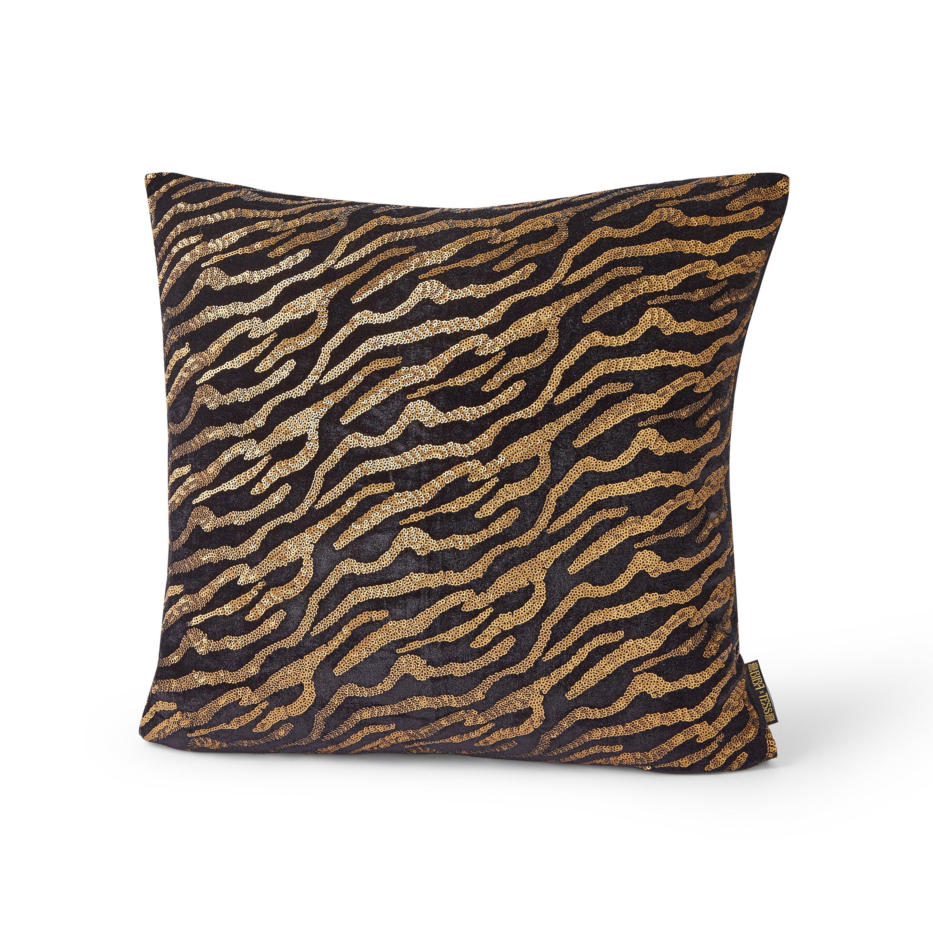 Über dieses Stück.... Dieses mit Pailletten gefüllte Kissen wurde exklusiv für Biba von Tess Daly entworfen, denn Kissen sollten niemals langweilig sein!! Perfekt für den Wohnbereich oder das Schlafzimmer. Intrikates Pailletten-Design auf hochwertigem Samt, mit einer superweichen Kunstleder-Rückseite. Ob das mehrfarbige Wirbel-Design oder das goldene Zebra, wir wissen, dass diese Kissen jedes Zuhause aufwerten werden.