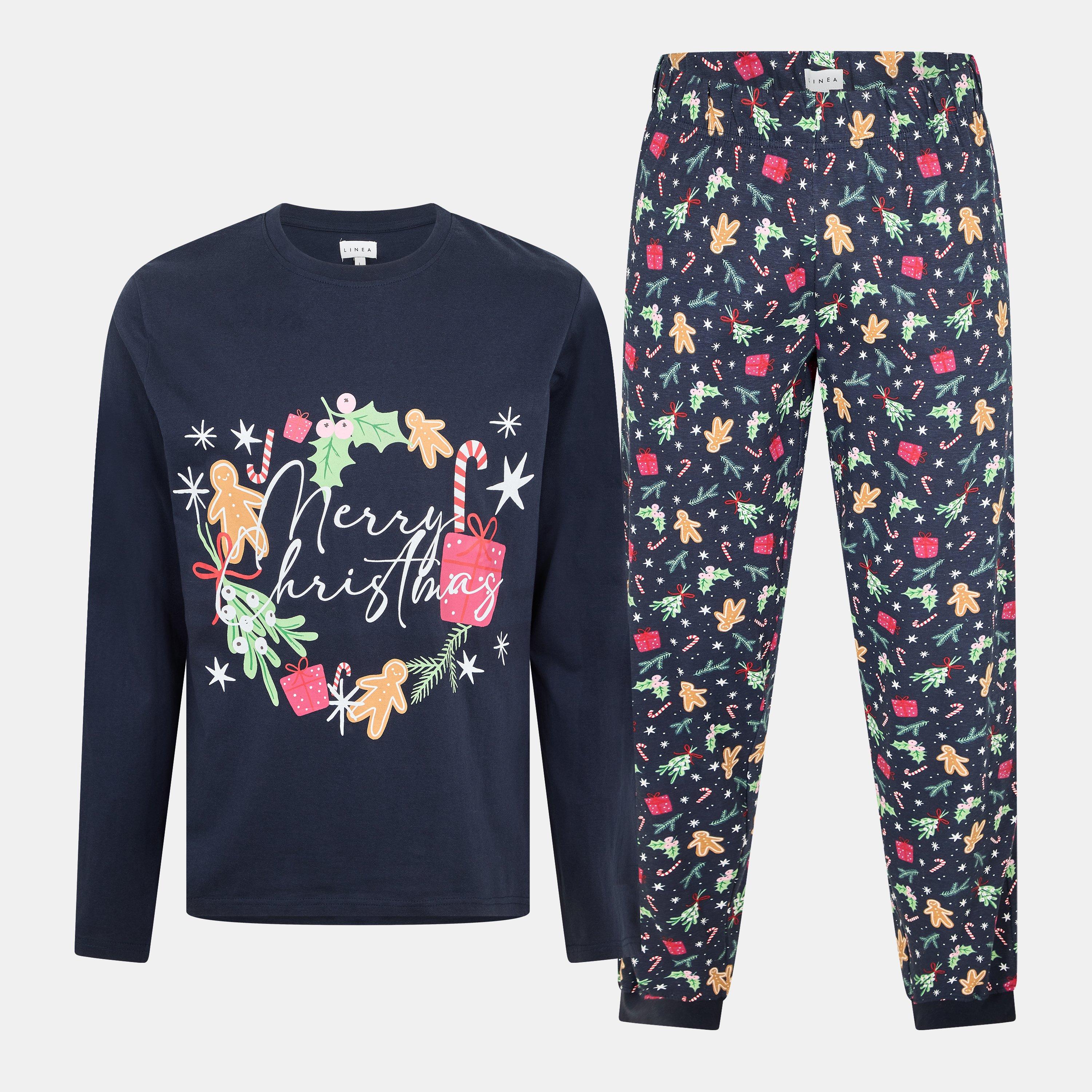 Kuscheln Sie sich in saisonalen Charme mit diesen Linea Lebkuchen Langarm-Pyjamas. Das festliche Oberteil verfügt über einen verspielten Lebkuchen-Druck, während die passenden Hosen mit gerippten Bündchen für einen bequemen Sitz sorgen. Ein regulärer Schnitt mit Rundhalsausschnitt bietet Komfort für gemütliche Feiertagsabende.